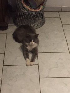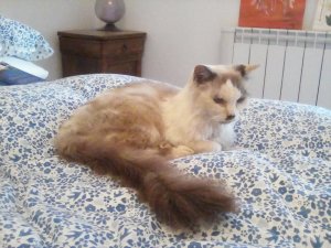 Mili is semi long haired and, in her prime, would have been a big cat, probably a rag doll cross. She had been found in the street in very poor condition. However, she hadn’t lost her attitude and greeted me with a very raucous meow and hugged my neck with her front paws. Her chances of being adopted were very slim but, me, I’m a soft touch! After several visits to the vets, to get her arthritis treatment sorted out, there’s been no looking back. She now has a monthly injection and when she wants to she can get a good turn of speed on and good jumping abilities, but only if she thinks you’re not looking! Her favourite meal is boiled chicken and the others don’t get a look in. She doesn’t put up with any nonsense from other cats or dogs and will tell me where to go if I persist in grooming or moving her. She kindly lets me share my bed with her.