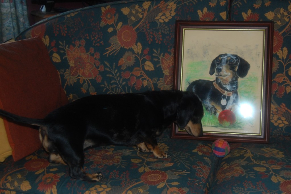 Daphne is a feisty little, mostly black, glossy Miniature Dachsund, with a mischievous glint to her eyes. Always a ball near to paw or firmly grasped in her jaws.